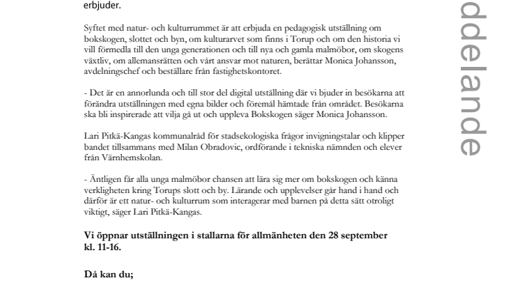 Syftet med natur- och kulturrummet är att erbjuda en pedagogisk utställning om bokskogen, slottet och byn, om kulturarvet som finns i Torup och om den historia vi vill förmedla till den unga generationen och till nya och gamla malmöbor, om skogens växtliv, om allemansrätten och vårt ansvar mot naturen, berättar Monica Johansson, avdelningschef och beställare från fastighetskontoret.