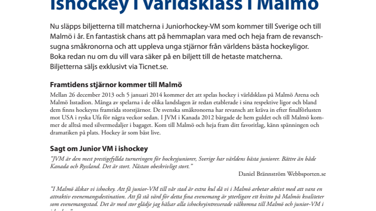 Nu släpps biljetterna till matcherna i Juniorhockey-VM som kommer till Sverige och till Malmö i år. En fantastisk chans att på hemmaplan vara med och heja fram de revansch-sugna småkronorna och att uppleva unga stjärnor från världens bästa hockeyligor. Boka redan nu om du vill vara säker på en biljett till de hetaste matcherna.Biljetterna säljs exklusivt via Ticnet.se.