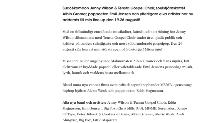 Succékombon Jenny Wilson & Tensta Gospel Choir, soulstjärnskottet Albin Gromer, poppoeten Emil Jensen och ytterligare tio artister har nu adderats till min line-up den 19-26 augusti!