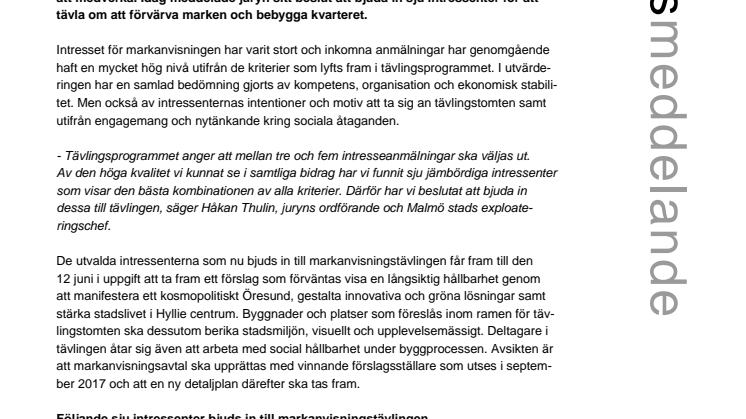 - Tävlingsprogrammet anger att mellan tre och fem intresseanmälningar ska väljas ut. Av den höga kvalitet vi kunnat se i samtliga bidrag har vi funnit sju jämbördiga intressenter som visar den bästa kombinationen av alla kriterier. Därför har vi beslutat att bjuda in dessa till tävlingen, säger Håkan Thulin, juryns ordförande och Malmö stads exploateringschef.