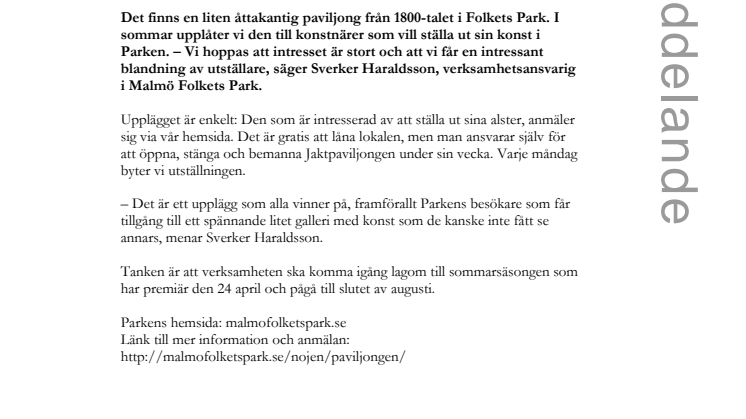 Det finns en liten åttakantig paviljong från 1800-talet i Folkets Park. I sommar upplåter vi den till konstnärer som vill ställa ut sin konst i Parken. – Vi hoppas att intresset är stort och att vi får en intressant blandning av utställare, säger Sverker Haraldsson, verksamhetsansvarig i Malmö Folkets Park.