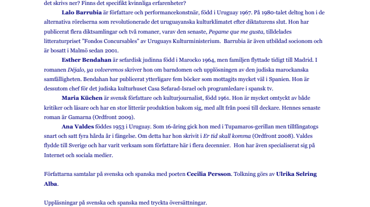 Poeten Cecilia Persson leder ett samtal på bibliotekets scen med en rad spännande författare. Esther Bendahan är sefardisk judinna född i Marocko, men familjen flyttade tidigt till Madrid. Ana Valdes föddes i Uruguay där hon gick med i gerillan och fängslades i fyra år. Om detta har hon skrivit i Er tid skall komma. Valdes flydde till Sverige och har varit verksam som författare här i flera decennier. Under kvällen samtalar Bendahan och Valdes med författarna Maria Küchen och Lalo Barrubia på bibliotekets scen i Ljusets kalender.
