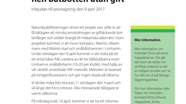 Naturskyddsföreningen driver ett projekt för att få båtägare att minska användningen av giftiga bottenfärger. Förhoppningen är att båtägarna istället ska gå över till mekaniska alternativ för att hålla sina båtar fria från påväxt. I Malmö samverkar Naturskyddsföreningen med Malmö stad och småbåtshamnen i Limhamn. Söndagen den 9 april, från klockan 11 och framåt, kommer ett antal båtar att mätas med XRF-metodik, en metod som baseras på röntgenflourescens. Båtägare i de tre båtklubbarna inom Limhamns småbåtshamn har bjudits in att medverka. På måndag kväll, den 10 april, kommer ett informationsmöte att hållas, där resultaten av söndagens mätning redovisas. Under informationsmötet kommer även alternativa metoder till att använda giftläckande bottenfärger att presenteras. Genom att använda mekaniskt alternativ för borttagning av påväxt, kan utsläppen minskas.