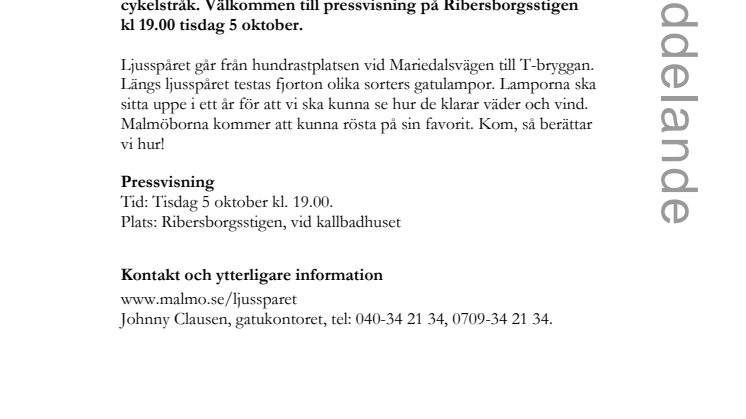 Ljusspåret går från hundrastplatsen vid Mariedalsvägen till T-bryggan. Längs ljusspåret testas fjorton olika sorters gatulampor. Lamporna ska sitta uppe i ett år för att vi ska kunna se hur de klarar väder och vind. Malmöborna kommer att kunna rösta på sin favorit. Kom, så berättar vi hur!