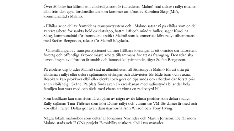 - Elbilar är en del av framtidens transportsystem och i Malmö satsar vi på elbilar som en del av vårt arbete för sänkta koldioxidutsläpp, bättre luft och mindre buller, säger Karolina Skog, kommunalråd för framtidens trafik i Malmö, som kommer att köra rallyt tillsammans med Stefan Bengtsson, rektor för Malmö högskola.