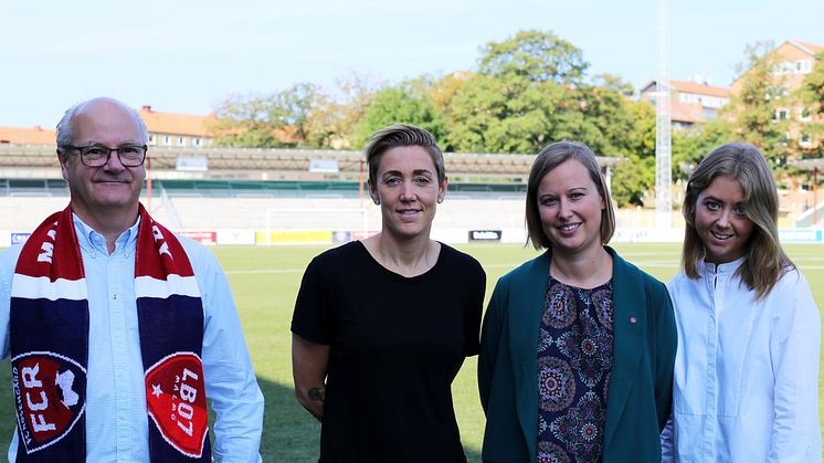 På bilden: Johan Andersson, LB07, Therese Sjögran, FC Rosengård, Frida Trollmyr (S), fritidskommunalråd samt Isabelle Widmark, Fair Pay. Foto: Emilie Ekelund