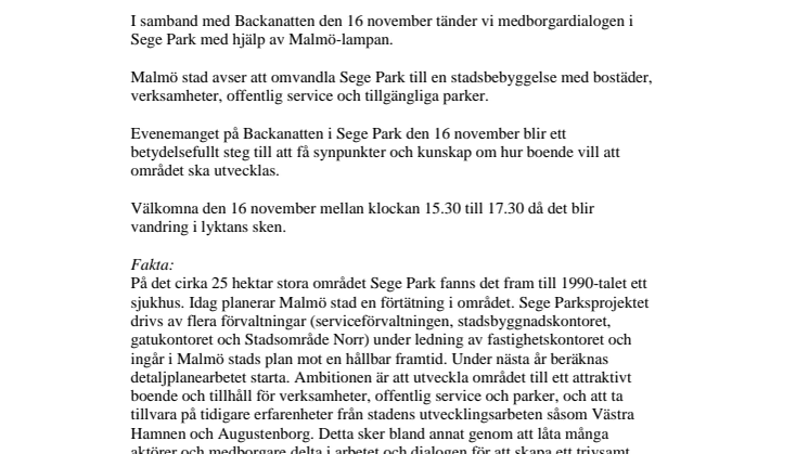 I samband med Backanatten den 16 november tänder vi medborgardialogen i Sege Park med hjälp av Malmö-lampan.