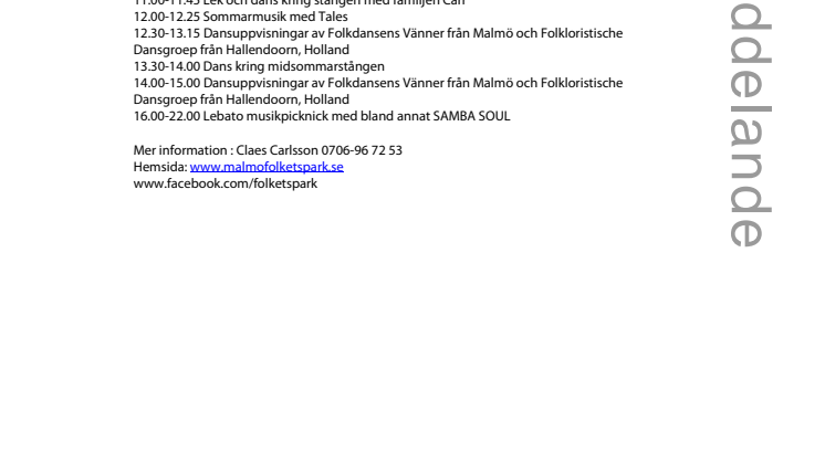 Man hinner med mycket på tolv timmars midsommarfirande i Folkets Park. Firandet inleds kl. 10 med att vi klär midsommarstången till tonerna av sommarmusik. Kvällen avslutas med musikpicknick med framträdande av Samba Soul fram till kl. 22