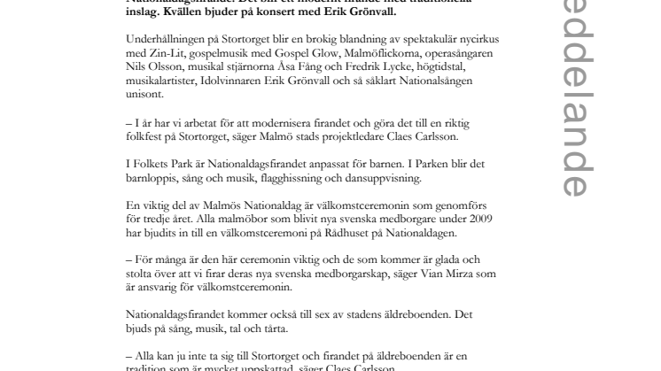 I år är det Stortorget som är huvudplatsen för Malmös Nationaldagsfirande. Det blir ett modernt firande med traditionella inslag. Kvällen bjuder på konsert med Erik Grönvall.