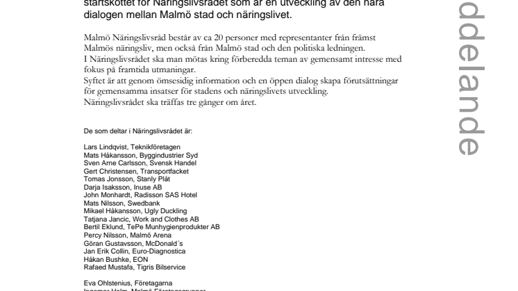 Malmö Näringslivsråd, som har bildats och upprättats under våren 2009 träffades för första gången den 19 maj. Det inledande mötet var startskottet för Näringslivsrådet som är en utveckling av den nära dialogen mellan Malmö stad och näringslivet.