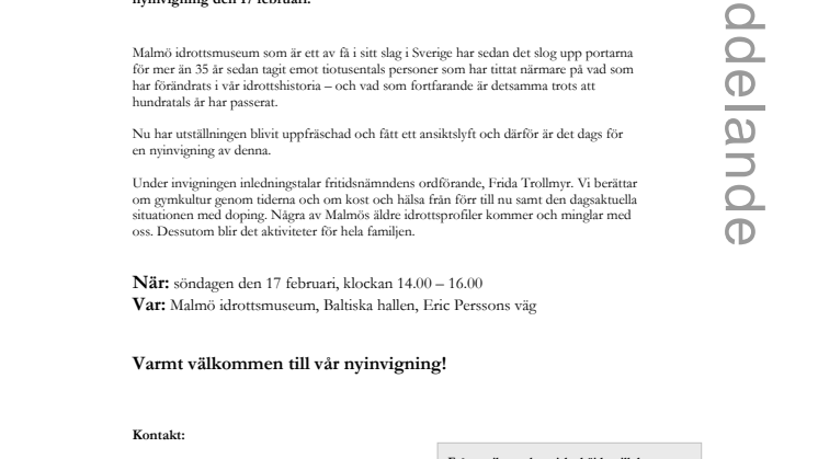 Påminnelse - nyinvigning på Malmö Idrottsmuseum