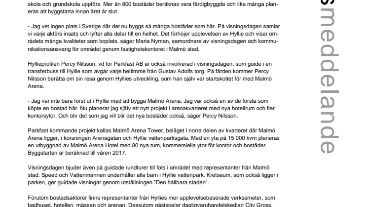 I år kommer fler än 800 bostäder stå klara i Hyllie och lika många börja byggas. För att lyfta området som en ny boplats arrangerar Malmö stad en stor visningsdag med aktuella bostadsaktörer i Malmö Arena lördagen den 3 september kl 10-16. Från Gustav Adolfs torg avgår gratis transferbuss varje heltimme till utställningen med Hyllieprofilen Percy Nilsson som guide.