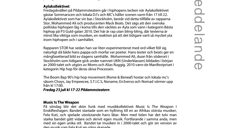 Sommarscen fortsätter i helgen sin satsning på den unga publiken. Hiphopgruppen Aylakollektivet, som vann i kategorin Bästa hiphop på P3 Guld-galan 2010 gästar Pildammsteatern och levererar hiphop med budskap och på söndag bjuder musikkollektivet Music Is The Weapon från Stockholm på nigeriansk funk i Enskifteshagen.