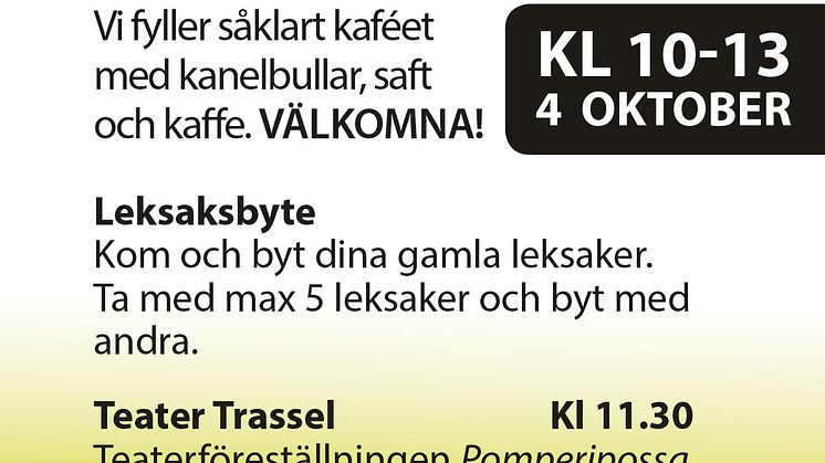 På programmet står bland annat leksaksbyte, ansiktsmålning och teaterföreställningen Pomperipossa med Teater Trassel. Eftersom det är Kanelbullens dag bjuds det även på ett välfyllt kanelbullecafé!