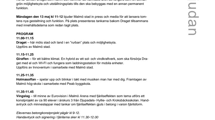 Måndagen den 13 maj kl 11-12 bjuder Malmö stad in press och media för att lansera tomtens nya gestaltning och funktion. På plats presenteras tankarna bakom Draget tillsammans med innehållsdelarna som redan tagit plats.