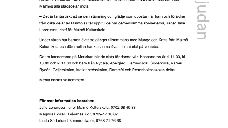 De tre konserterna på Moriskan blir de sista för denna vår. Konserterna är kl 11.00, kl 13.00 och kl 14.30 och barn från Nydala, Apelgård, Hermodsdal, Söderkulla, Värner Rydén, Geijerskolan, Mellanhedsskolan, Dammfri och Rosenholmsskolan deltar.