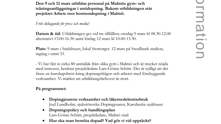 Den 9 och 12 mars utbildas personal på Malmös gym- och träningsanläggningar i antidopning. Bakom utbildningen står