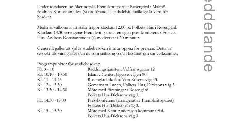 Media är välkomna att ställa frågor klockan 12.00 på Folkets Hus i Rosengård. Klockan 14.30 arrangerar Fremskrittspartiet en egen presskonferens i Folkets Hus. Andreas Konstantinides (s) medverkar i 20 minuter.