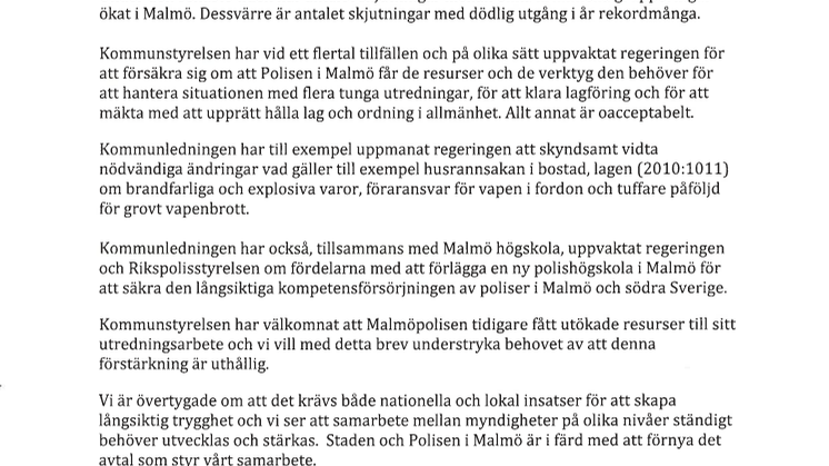 Kommunledningen har uppmanat regeringen att skyndsamt vidta nödvändiga lagändringar och säkerställa långsiktiga resurser. Kommunledningen har också, tillsammans med Malmö högskola, uppvaktat regeringen och rikspolischefen om behovet av en polishögskola i Malmö.
