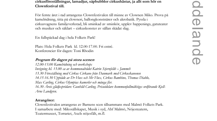 Den 7 augusti är det ingen vanlig dag i Malmö Folkets Park. Då fylls hela Parken med clowner, akrobater, trollkarlar, ballonger, leksaker, musik, cirkusföreställningar, lamadjur, såpbubblor cirkushästar, ja allt som hör en Clownfestival till.