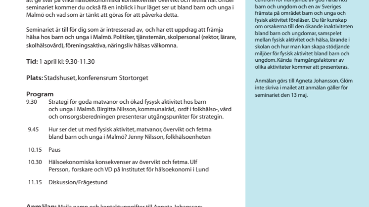 Som en del av förankringsprocessen anordnar folkhälsoenheten, Malmö stad ett antal seminarier om kost, fysisk aktivitet och övervikt och fetma. Det första seminariet, som äger rum den 1 april kl 9.30 i Stadshuset, kommer att inledas av kommunalrådet
