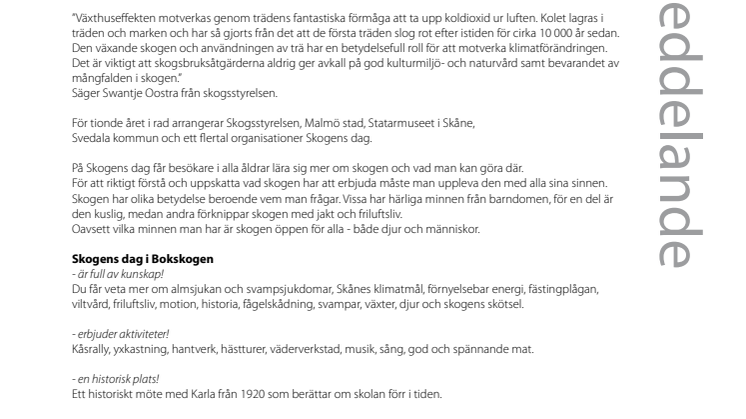 För tionde året i rad arrangerar Skogsstyrelsen, Malmö stad, Statarmuseet i Skåne, Svedala kommun och ett flertal organisationer Skogens dag.
