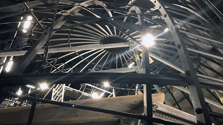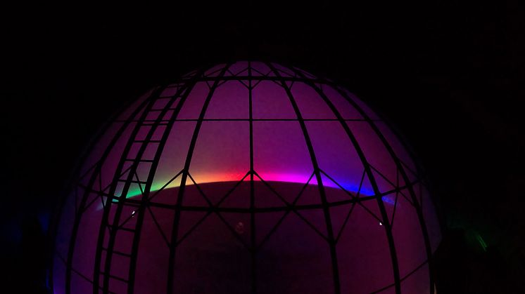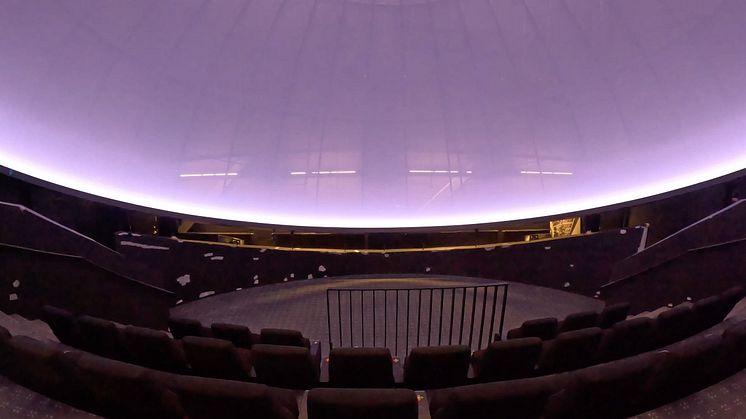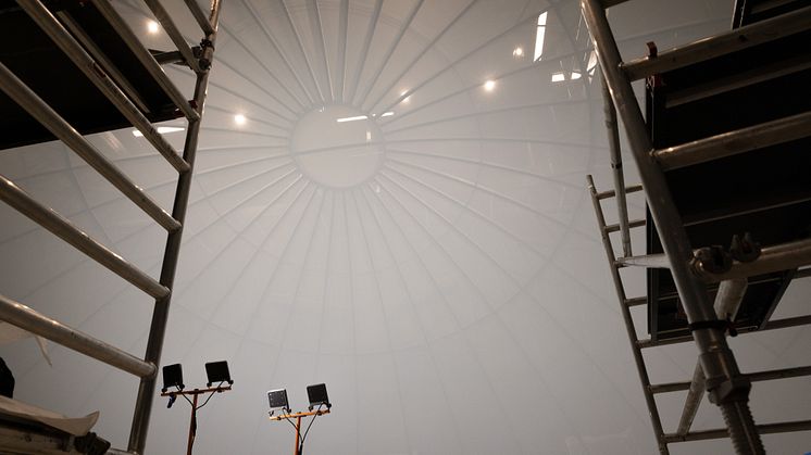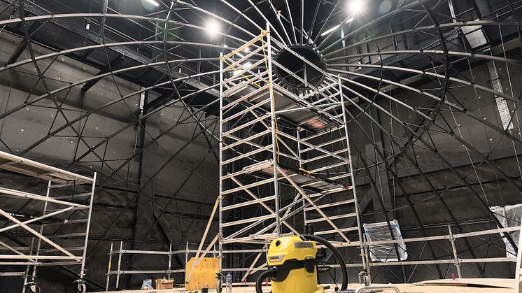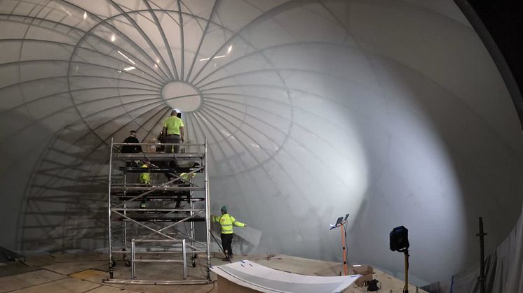 Under början av året har byggarbetet pågått för fullt i domteatern. Skärmen i domen är 11,5 meter i diameter och byggd av 103 aluminiumpaneler som monterats med cirka 10 000 nitar. Nu är den sista aluminiumplattan på plats och 360-gradersduken som skapar en kupol runt besökarna färdigmonterad.