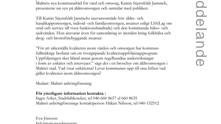 Malmös nya kommunalråd för vård och omsorg, Katrin Stjernfeldt Jammeh, presenterar sin syn på äldreomsorgen och samtalar med publiken.