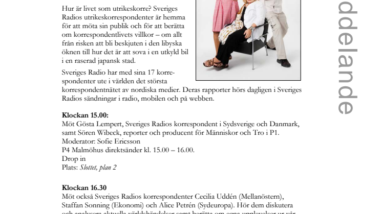 Möt också Sveriges Radios korrespondenter Cecilia Uddén (Mellanöstern), Staffan Sonning (Ekonomi) och Alice Petrén (Sydeuropa). Hör dem diskutera och analysera aktuella världshändelser samt berätta om egna upplevelser ur vår tids historia. Moderator: Erik Blix