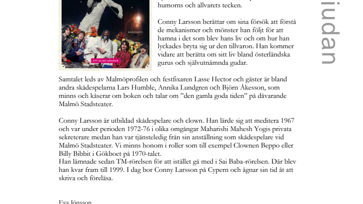 Conny Larsson presenterar och läser ur sin nyutkomna bok och utlovar en spännande kväll i humorns och allvarets tecken.