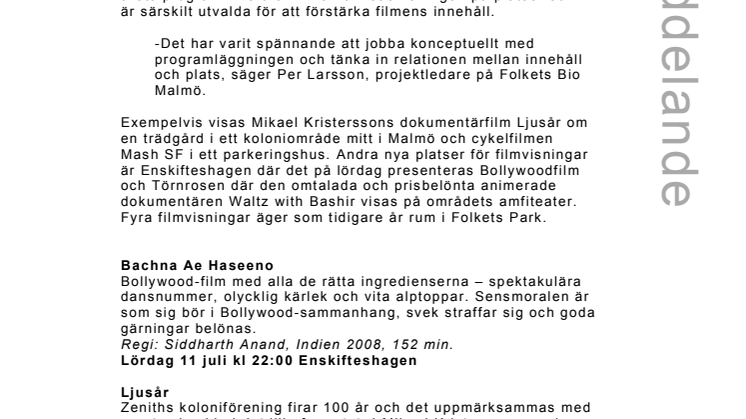 På lördag inleds Sommarscens utomhusbio-program i samarbete med Folkets Bio. Totalt presenteras åtta filmer på fem olika platser i Malmö. Just platsen och rummet är av stor betydelse i årets program. Flera av fimerna visas nämligen på platser som är särskilt utvalda för att förstärka filmens innehåll.