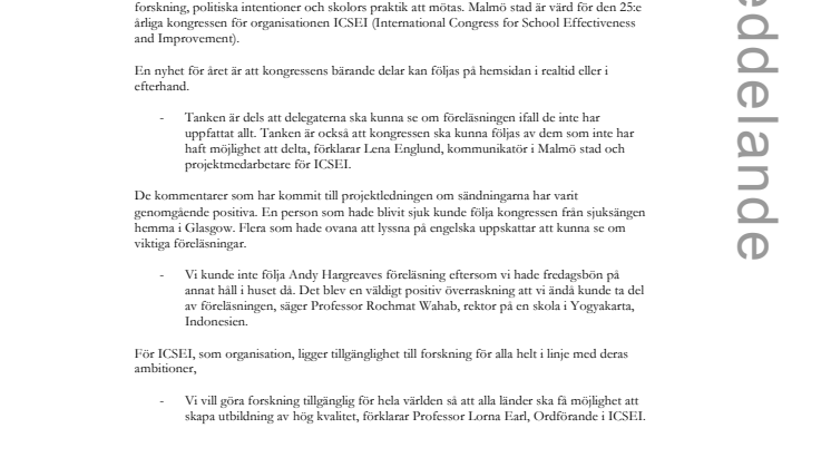 Världsledande forskare, skolledare, och politiker träffas 5-8 januari för att hitta vägar för forskning, politiska intentioner och skolors praktik att mötas. Malmö stad är värd för den 25:e årliga kongressen för organisationen ICSEI (International Congress for School Effectiveness and Improvement).