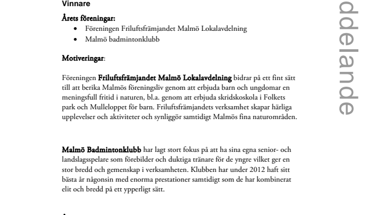 För mer information om Årets förening och Årets Eldsjäl: Kontakta Frida Trollmyr, fritidsnämndens ordförande, 0736 29 79 12, frida.trollmyr@malmo.se