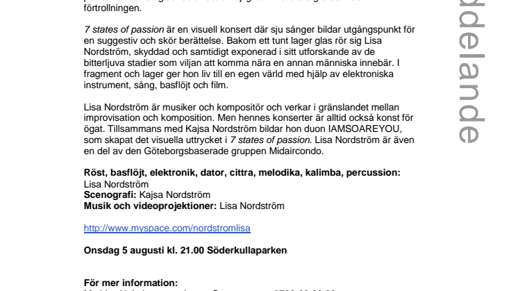 Sommarscen gör nedslag i Söderkullaparken! I ett glashus framför Lisa Nordström från electronicaduon Midaircondo sitt verk 7 states of passion, en suggestiv visuell konsert där akustiska instrument blandas med elektronik, sång och video. Alla som gett sig tid att lyssna till gruppen Midaircondo vet att det är mödan värt. När Lisa Nordström spelar solo är det än fler akustiska instrument och elektronik som skapar en förfinad pop. När det dessutom framförs som en performance i ett glashus är det omöjligt att inte låta sig dras med i förtrollningen. 7 states of passion är en visuell konsert där sju sånger bildar utgångspunkt för en suggestiv och skör berättelse. Bakom ett tunt lager glas rör sig Lisa Nordström, skyddad och samtidigt exponerad i sitt utforskande av de bitterljuva stadier som viljan att komma nära en annan människa innebär. I fragment och lager ger hon liv till en egen värld med hjälp av elektroniska instrument, sång, basflöjt och film. Röst, basflöjt, elektronik, dator, cittra, melodika, kalimba, percussion: Lisa Nordström http://www.myspace.com/nordstromlisa Onsdag 5 augusti kl. 21.00 Söderkullaparken