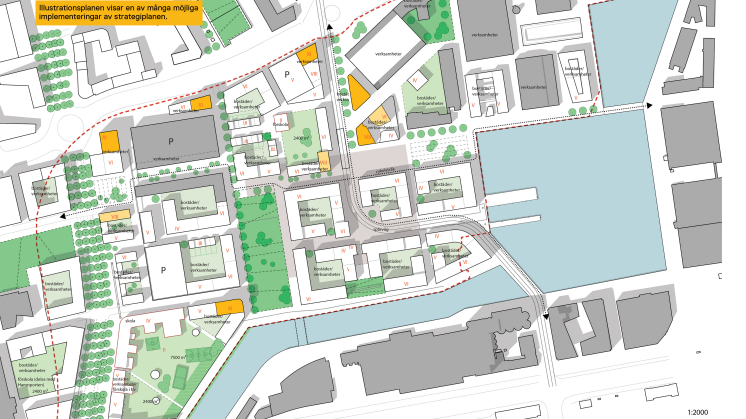 • Skiss över ett storkvarter i sydvästra delen av Varvsstaden, med grundskola, förskola och bostäder.
