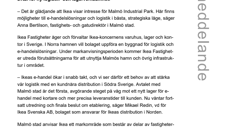 • Markanvisning till Ikea för storsatsning i Malmö Industrial Park