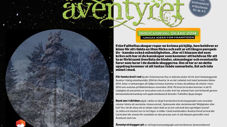 Från den 23 april till 5 juni pågår Äventyret i Fulltofta. Då smyger 2400 fjärdeklassare från hela Skåne fram genom Skånes kulturlandskap för att lyckas med uppdraget att rädda den nödställda Miranda från en överbeskyddande robot. Barnen medlar i konflikter och löser problem med hjälp av kunskap, innovation och mod.