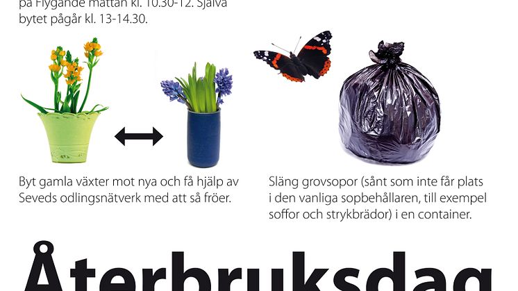 På lördag ska det bytas grejer på Sevedsplan! Det blir folk-, vår- och miljöfest i ett. Under återbruksdagen kommer man att kunna byta saker och växter som man inte längre vill ha mot någonting annat. Designduon LAKy ger tips på hur man kan snygga till gamla möbler. Seveds odlingsnätverk visar hur man lyckas med vårplanteringen. Dessutom bjuds det på ekologisk soppa, dans och musik.
