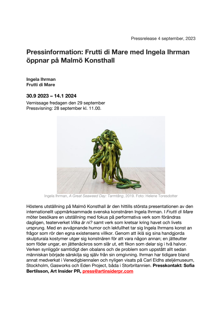 Höstens utställning Frutti di Mare på Malmö Konsthall är den hittills största presentationen av den internationellt uppmärksammade svenska konstnären Ingela Ihrman. Utställningsperiod: 30 sep 2023 - 14 jan 2024. Vernissage fredagen den 29 september. Pressvisning: 28 september kl. 11.00.