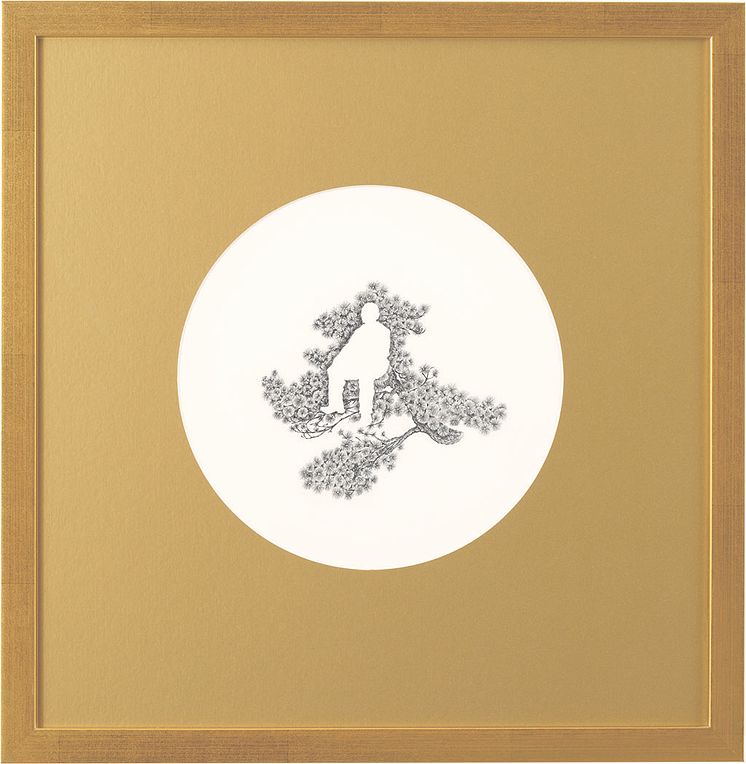 En av sju teckningar från serien Ode to the Pine (For Long and Faithful Service) Blyerts på papper, guldfärgad passepartout, guldram, 44 x 43 cm. Courtesy Konstnären och Galerie Nordenhake Stockholm/Berlin/Mexico City.