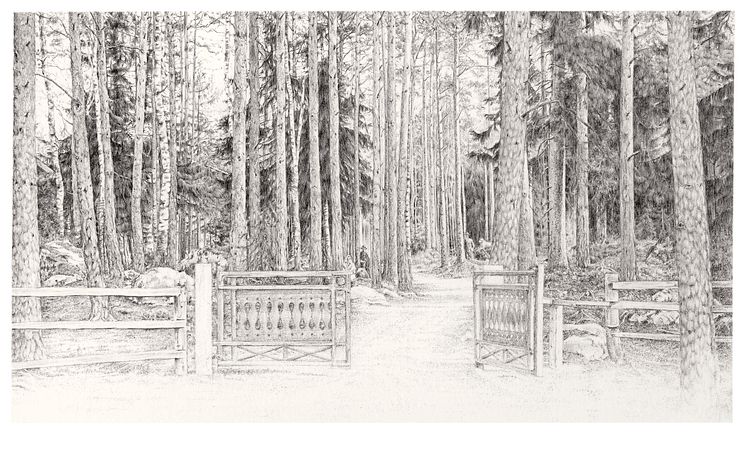 Ann Böttcher. Entrén till sanatoriet, 2007. Blyerts på papper, 40x50 cm © Bonniers Konsthall