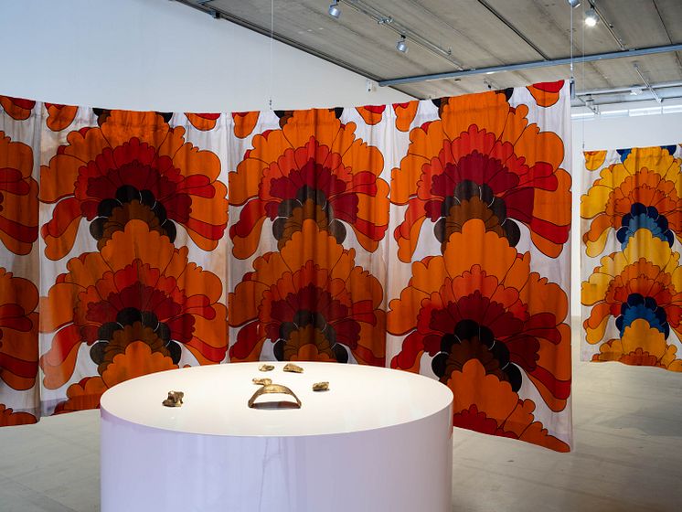 Installationsbild, Bonniers Konsthall 2020. Sex avgjutningar i brons, spiralformad gardinskena på 18,5 m, 17 gardinlängder, 155x110 cm vardera. Courtesy konstnären & Galerie Nordenhake Stockholm/Berlin/Mexico City.