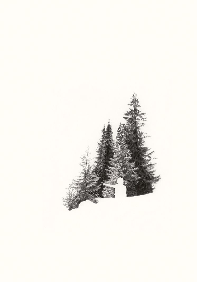 Ann Böttcher. Pekar genom en tysk skog, 2002. Blyerts på papper, 29,7x42 cm