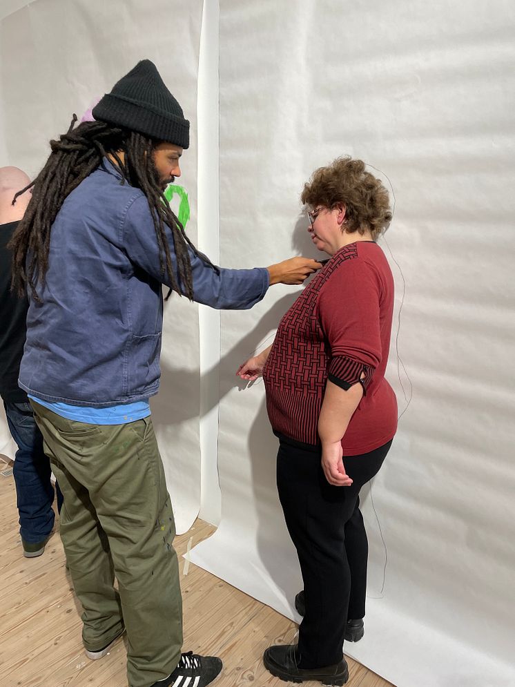 Konstnären Kim Demåne skapade en animerad film utifrån silhuetter tillsammans med deltagarna på daglig verksamhet. Här ritar han av Christina.