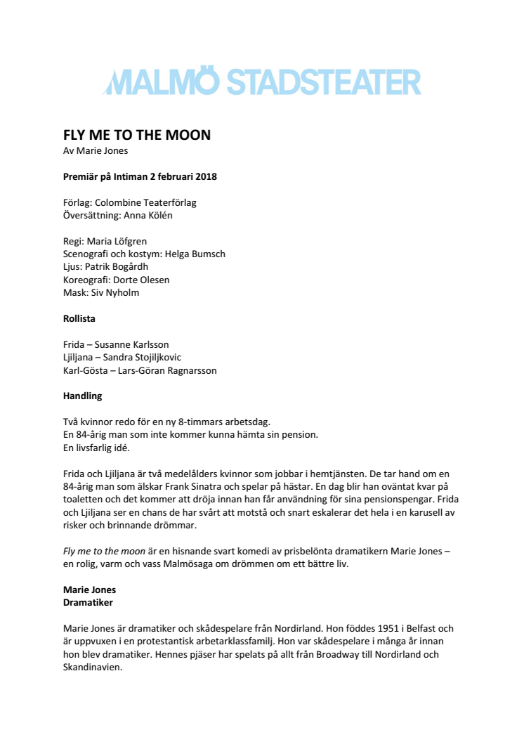 Prisbelönade dramatikern Marie Jones hisnande svarta komedi Fly me to the moon har premiär på Intiman 2 februari. En rolig, varm och vass Malmösaga om drömmen om ett bättre liv.