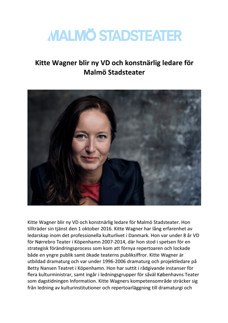 Kitte Wagner tar över ledarskapet för Malmö Stadsteater från 1 oktober 2016.