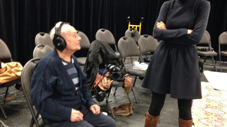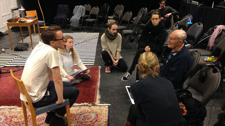 Överlevaren Stefan Zablocki i samtal med regissören Sara Cronberg och skådespelaren Olof Yassin under repetitionsarbetet med Ögonvittnen vintern 2020. Foto: Malmö Stadsteater