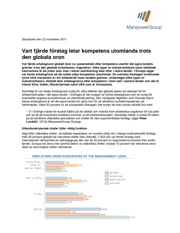 Var fjärde arbetsgivare globalt letar systematiskt efter kompetens utanför det egna landets gränser trots den globala krisen. Ingenjörer, industriarbetare samt hantverkare är de yrken som man i störst utsträckning letar efter. I Europa säger var femte arbetsgivare att de måste söka kompetens utomlands. De svenska företagen tycks hitta merparten av sin arbetskraft inom landets gränser.