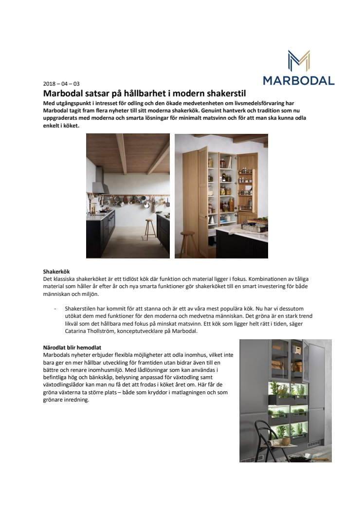 Med utgångspunkt i intresset för odling och den ökade medvetenheten om livsmedelsförvaring har Marbodal tagit fram flera nyheter till sitt moderna shakerkök. Genuint hantverk och tradition som nu uppgraderats med moderna och smarta lösningar för minimalt matsvinn och för att man ska kunna odla enkelt i köket.
