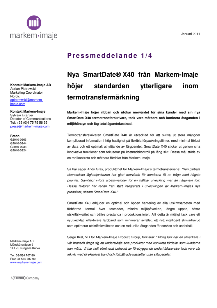 Nya SmartDate® X40 för termotransfermärkning från marknadsledande Markem-Imaje